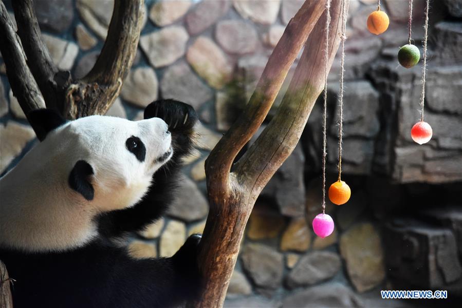 Giant panda "Erxi" enjoys a ball-shaped fruit ice cube prepared by feeders at an air-conditioned room in Jinan Wildlife World in Jinan, east China's Shandong Province, June 14, 2020. The zoo has prepared an air-conditioned room and ice cubes to keep the giant panda cool as the temperature kept rising in Jinan in recent days. (Xinhua/Wang Kai)