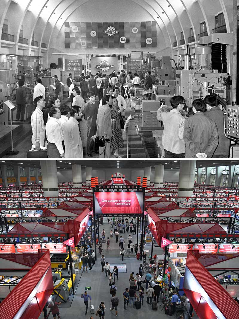Combo photo shows the Hall of Machinery on the 45th Canton Fair in 1979 (upper, taken by Li Yanming) and the Hall of Machinery & Equipment on the 124th Canton Fair on Oct. 15, 2018 (lower, taken by Liang Xu). (Xinhua)