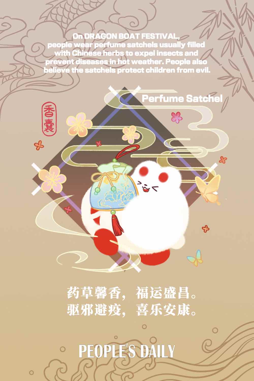 Wearing a perfume satchel is one of the traditional customs of the Dragon Boat Festival. Perfume satchels are usually made of five-color silk thread, or colored satin or cloth wrapped with cotton and then embroidered with colored silk. People typically filled the sachets with a variety of fragrant herbal medicine to repel insects and avoid illnesses. Children wear perfume satchels to ward off evil spirits during the Dragon Boat Festival. Nowadays, sachets come in various shapes and are a common handicraft. In some cities in southern China, young men and women also use sachets to express their love.