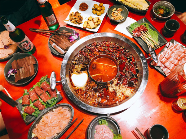 Beef and vegetables surround a spicy hotpot at a Sichuan-style hotpot restaurant in Beijing. [Photo by Liu Zhe/China Daily]