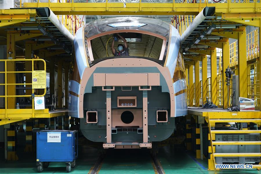 A technician works on a high-speed trains production line of CRRC Tangshan Co., Ltd. in Tangshan City in north China's Hebei Province, July 16, 2020. The production capacity of this company has recovered from the effect of COVID-19 with the help of local governments to fulfil the orders from home and abroad. (Xinhua/Xing Guangli)