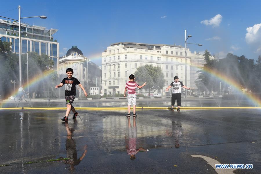Children cool off near a water spray on Schwarzenbergplatz in Vienna, Austria, on July 28, 2020. The highest temperature in Vienna reached 37.2 degrees Celsius on Tuesday. (Xinhua/Guo Chen)