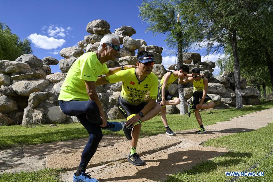 Photo taken on July 26, 2020 shows Gu Dawo (1st L), an endurance sports enthusiast, stretching together with his triathlon club teammates after attending a cycling training in Yinchuan, northwest China's Ningxia Hui Autonomous Region. Gu Dawo, a 75-year-old Chinese grandpa, finished this year's Xiamen International Marathon with a remarkable time of 4 hours, 23 minutes and 45 seconds, which astonished many younger runners. Having embarked on training for marathon at the age of 69, Gu finished his first half marathon in 2013. Since then, Gu has begun running numberous marathon events across China. In 2017, Gu showed up as the oldest-ever offical pacer in Yinchuan Internaional Marathon. After swimming and cycling became parts of his daily fitness, Gu made attempts to train for triathlon, a multisport with three continuous and sequential endurance races. In 2017, he went to Chattanooga of Tennessee of the United States to compete in the Ironman 70.3. As the oldest one to complete the triathlon in the event, Gu was introduced to be from China in the award ceremony. Gu Dawo wants to encourage the young to exercise more, and also correct their bias against the aged. "The age will not stop my heart and feet from running ahead." Gu said. (Xinhua/Feng Kaihua)