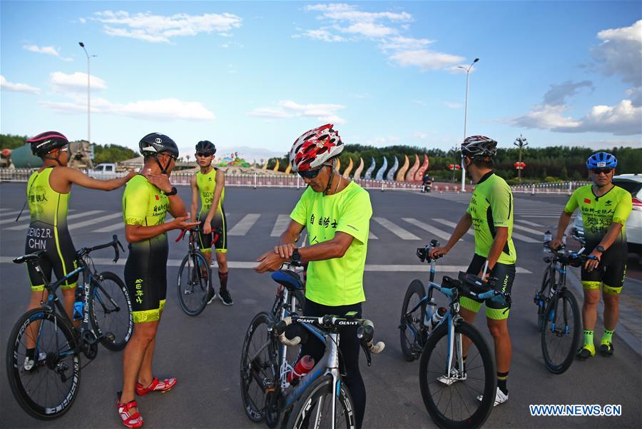 Photo taken on July 26, 2020 shows Gu Dawo (1st L), an endurance sports enthusiast, stretching together with his triathlon club teammates after attending a cycling training in Yinchuan, northwest China's Ningxia Hui Autonomous Region. Gu Dawo, a 75-year-old Chinese grandpa, finished this year's Xiamen International Marathon with a remarkable time of 4 hours, 23 minutes and 45 seconds, which astonished many younger runners. Having embarked on training for marathon at the age of 69, Gu finished his first half marathon in 2013. Since then, Gu has begun running numberous marathon events across China. In 2017, Gu showed up as the oldest-ever offical pacer in Yinchuan Internaional Marathon. After swimming and cycling became parts of his daily fitness, Gu made attempts to train for triathlon, a multisport with three continuous and sequential endurance races. In 2017, he went to Chattanooga of Tennessee of the United States to compete in the Ironman 70.3. As the oldest one to complete the triathlon in the event, Gu was introduced to be from China in the award ceremony. Gu Dawo wants to encourage the young to exercise more, and also correct their bias against the aged. "The age will not stop my heart and feet from running ahead." Gu said. (Xinhua/Feng Kaihua)