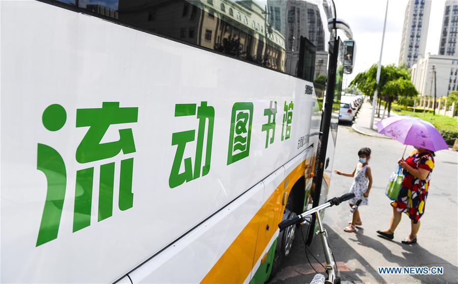 People get on a mobile library transformed from a bus in Changchun, northeast China's Jilin Province, Aug. 5, 2020. Changchun Library converted a bus into a mobile library which circulates at 15 fixed service points to provide citizens with book lending service. (Xinhua/Xu Chang)