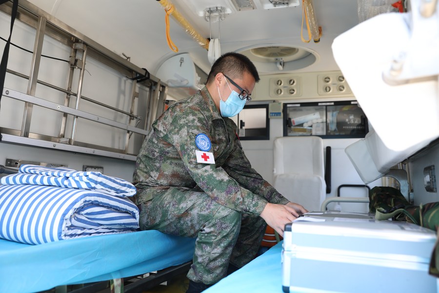 A Chinese peacekeeper checks inventory of medical supplies at the camp of the Chinese peacekeeping forces to Lebanon, on Aug. 5, 2020. (Xinhua)