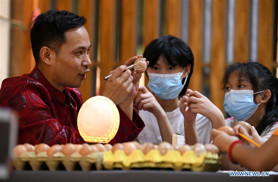 An artisan teaches children eggshell carving in a cultural industry zone in Qiaoxi District of Shijiazhuang City, north China's Hebei Province, Aug. 10, 2020. Qiaoxi has organized a series of activities to enrich children's summer vacation and promote the intangible cultural heritages. (Photo by Xu Jianyuan/Xinhua)