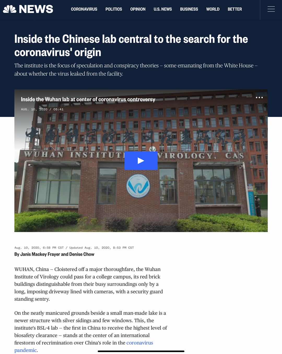 Ever since COVID-19 began spreading uncontrollably across the US, the White House and several US politicians have attempted to deflect away from their own failure in responding to the pandemic by coming up with conspiracy theories, one of which involved blaming the Wuhan Institute of Virology for leaking the virus. In response to these groundless accusations, the institute on Friday granted access to NBC news, allowing its journalists to meet with senior Chinese scientists working to pinpoint the origins of the virus, and gave them a tour of the facility.