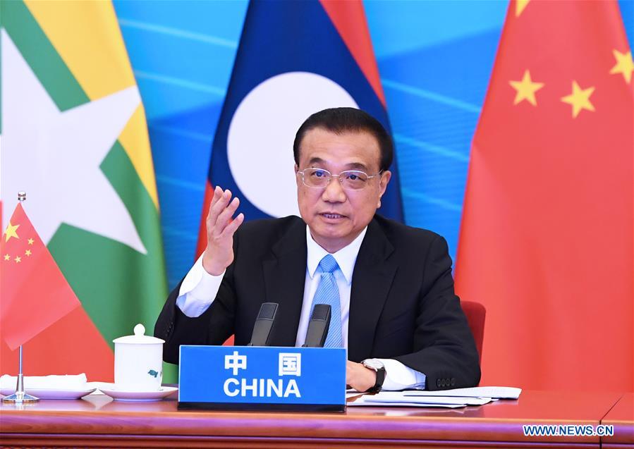 Chinese Premier Li Keqiang attends the third Lancang-Mekong Cooperation Leaders' Meeting via video link at the Great Hall of the People in Beijing, capital of China, Aug. 24, 2020. The meeting was co-chaired by Li Keqiang and Prime Minister Thongloun Sisoulith of Laos, and attended by Prime Minister Hun Sen of Cambodia, President U Win Myint of Myanmar, Prime Minister Prayut Chan-o-cha of Thailand, and Prime Minister Nguyen Xuan Phuc of Vietnam. (Xinhua/Rao Aimin)