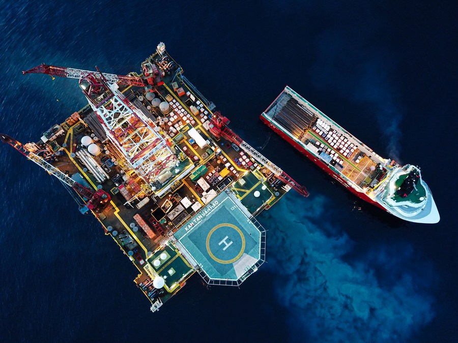 Aerial photo taken on July 29, 2020 shows the Kantan No.3 offshore oil platform and its supply ship in the northern waters of the South China Sea. (Xinhua/Pu Xiaoxu)
