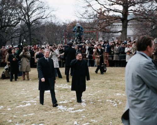 Former Vice Premier of China Deng Xiaoping and then U.S. President Jimmy Carter take a walk on the South Lawn at the White House, Jan. 30, 1979. File photo