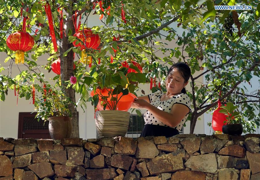 A villager waters flowers at her family inn in Dawanggou Village in Deting Town of Songxian County, Luoyang City, central China's Henan Province, Sept. 2, 2020. Dawanggou Village, located in a mountainous area, used to be an impoverished village. In recent years, the local government has made efforts in improving the living conditions of the villagers, carrying out relocation and renovation work. By improving the appearance of the village, rural tourism has been developed, which helps people here get rid of poverty without working far away from home. (Xinhua/Li An)