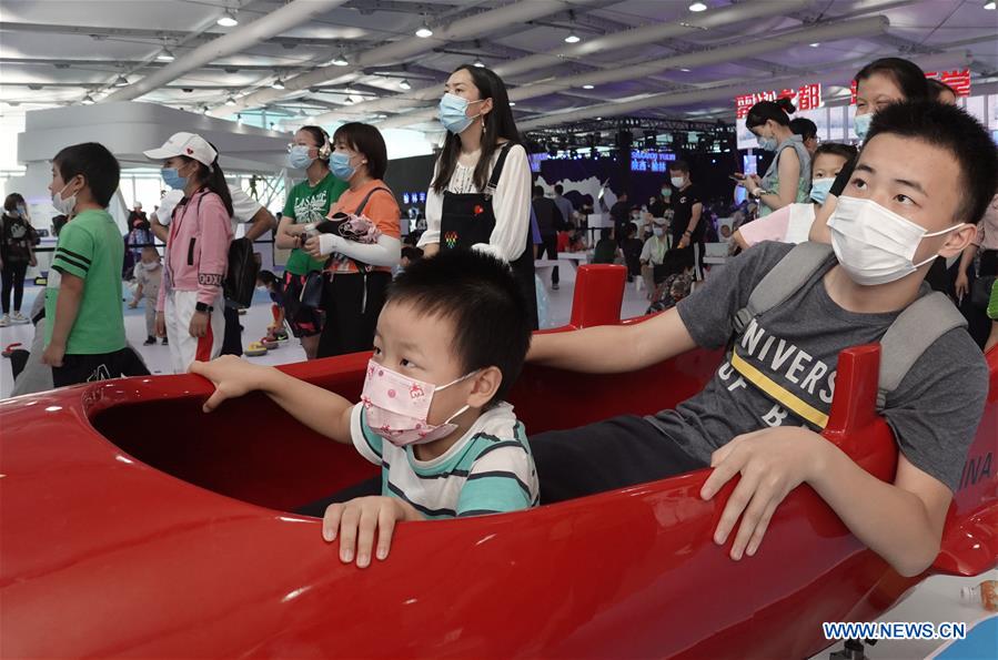 People experience a bobsleigh simulator at the Winter Sports Exhibition Hall of the 2020 China International Fair for Trade in Services (CIFTIS) in Beijing, capital of China, Sept. 6, 2020. The CIFTIS runs on Sept. 4-9 in Beijing. (Xinhua/Cai Yang)