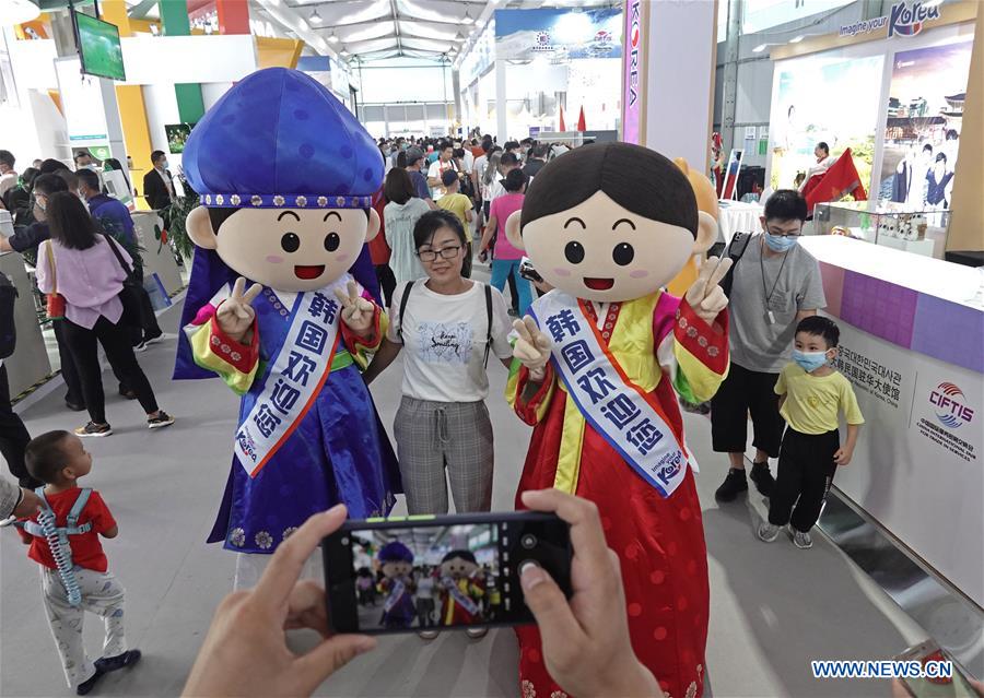 A visitor poses for photos at the booth of South Korea in the exhibition hall of Special Area for Countries, Provinces, Regions and Cities during the China International Fair for Trade in Services (CIFTIS) in Beijing, capital of China, Sept. 6, 2020. The CIFTIS runs on Sept. 4-9 in Beijing. (Xinhua/Cai Yang)