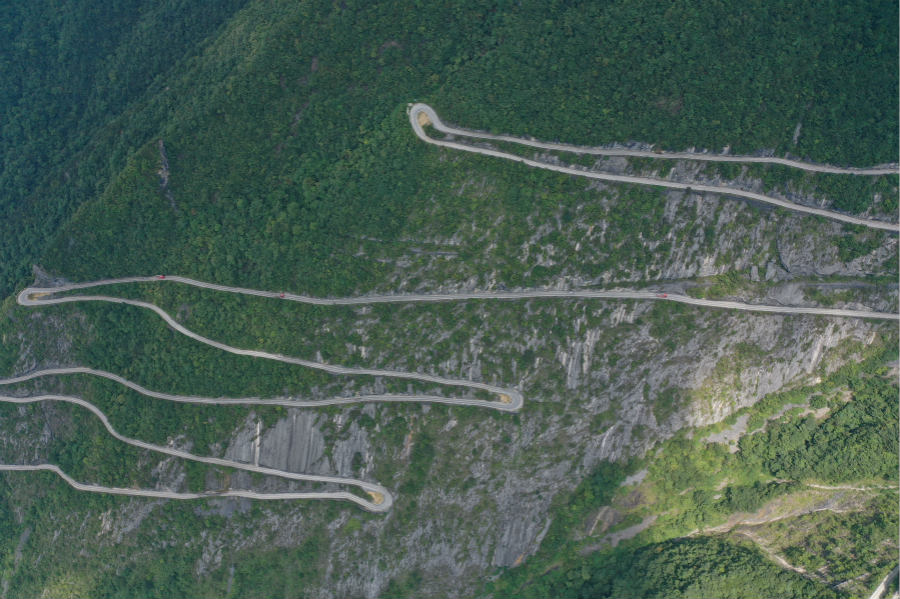 Aerial photo taken on Sept. 1, 2020 shows a view of the breathtaking "sky road" on the cliff in Enshi, in China's mountainous Hubei Province. The road looks like a jade belt in the mountains, and is known for its harrowing twists and turns. The daunting “sky road” shows the tremendous effort it took for local villagers to complete the construction, and their desire to connect with the outside world. The road attracts large numbers of driving enthusiasts from miles around.(People's Daily Online/Chen Bowen)