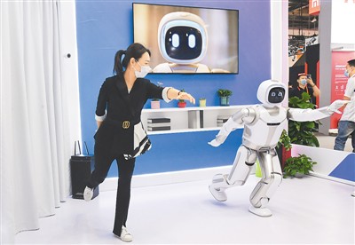 With its sleek appearance, professional manner and ability to give cordial greetings, a 5G-based humanoid robot bank lobby manager brought to CIFTIS by China Construction Bank (CCB) attracted a great deal of attention from visitors at the event.