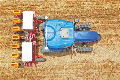 A tractor equipped with Beidou navigation system sow seeds in Anzhong village, Dengzhou city, central China’s Henan province. (Photo/Xinhua)