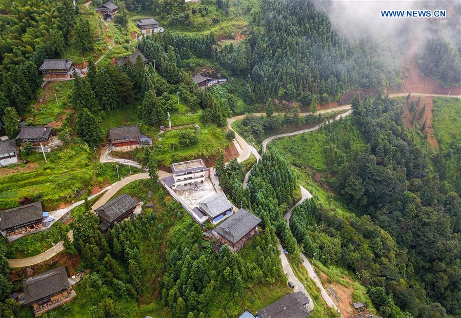 Photo taken with a drone on Sept. 9, 2020 shows the school building of Miaoben Primary School (in white) and its mountainous surroundings in Zhongcheng Township, Rongjiang County, southwest China's Guizhou Province. Gun Luquan and his wife Pan Mingzhen are a teacher couple who dedicated themselves to rural students at Miaoben Primary School for more than 20 years in mountainous Rongjiang County. As the school's only two remaining teaching staff members, Gun and Pan have never given up their original pursuit and tried their best to provide students with decent school experience. (Xinhua/Yang Wenbin)