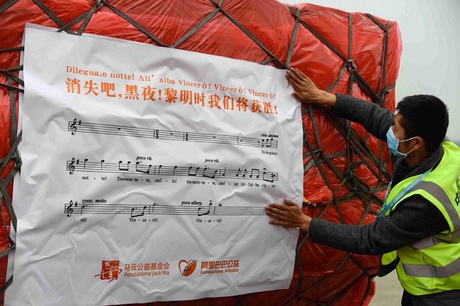 Chinese medical materials are prepared to be loaded onto a plane to Belgium at the Xiaoshan International Airport in Hangzhou, China's Zhejiang Province, March 13, 2020. /Xinhua