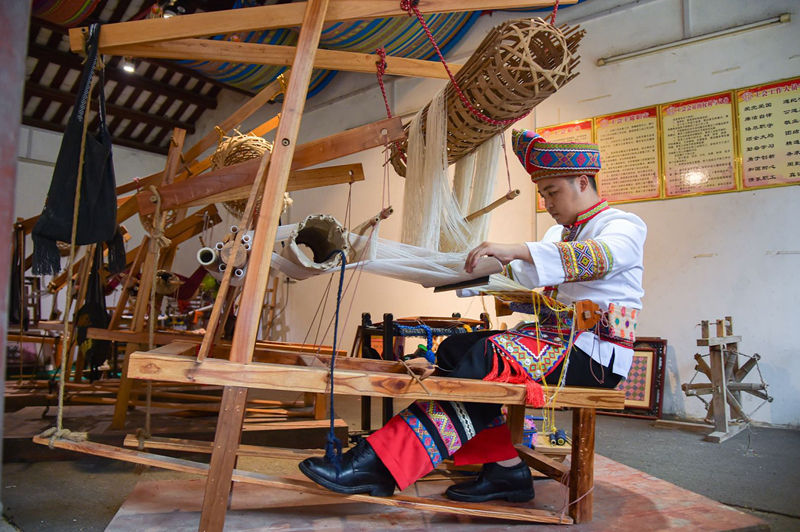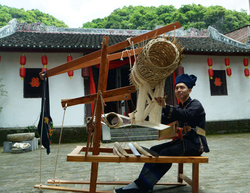To better protect and pass on the technique to future generations, Xincheng County has set up a Zhuang brocade productive protection and demonstration base. Built on the site where ancient government officials of Xincheng County used to have their residences, the base establishes a characteristic industrial chain for the integration of intangible cultural heritage with poverty alleviation.