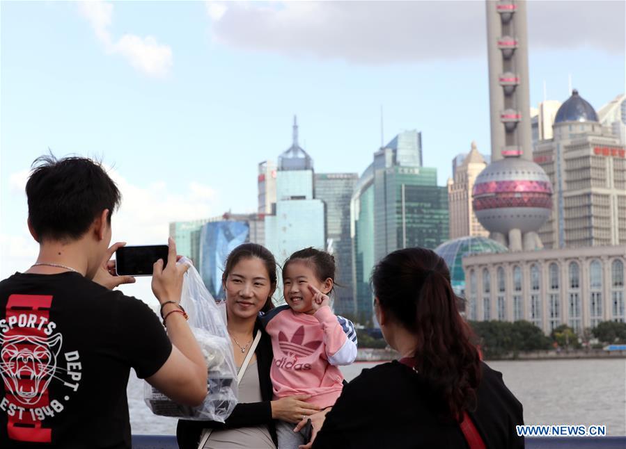 Tourists pose for photos at the Bund in east China's Shanghai, Oct. 8, 2020. (Xinhua/Liu Ying)