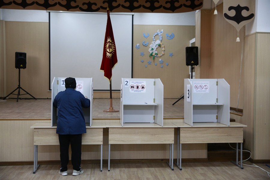 A person prepares to vote at a polling station in Bishkek, Kyrgyzstan on Oct. 4, 2020. (Photo by Roman/Xinhua)