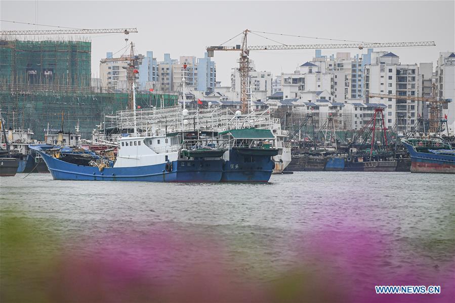 Photo taken on Oct. 13, 2020 shows ships at Xingang port in Haikou, south China's Hainan Province. The southern Chinese province of Hainan has ordered the suspension of all ferry services in the Qiongzhou Strait starting Tuesday, as the 16th typhoon of the year barrels toward land. Ferry operations between Hainan and Guangdong Province were halted from 3 a.m. Tuesday as a precaution against gales and torrential downpours, according to the Hainan Maritime Safety Administration. (Xinhua/Pu Xiaoxu)