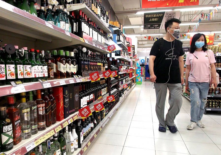 Consumers walk past the imported products area of a supermarket in Shanghai, east China, July 14, 2020. (Xinhua/Chen Fei)