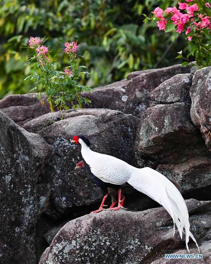 Two silver pheasants rest on a rock at the Exiandong nature reserve in Nanjing County, southeast China's Fujian Province, Oct. 14, 2020. (Xinhua/Peng Zhangqing)