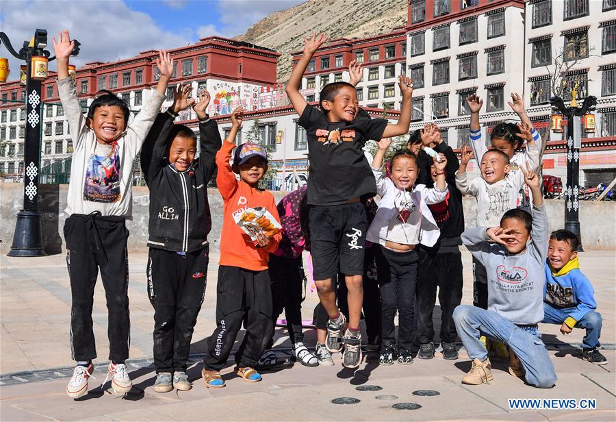 Children hail as they play at a relocation site in Baxoi County, southwest China's Tibet Autonomous Region, Sept. 19, 2020. Southwest China's Tibet Autonomous Region has accomplished the historical feat of eradicating absolute poverty, according to a press briefing held in the regional capital of Lhasa on Thursday. (Xinhua/Jigme Dorje)