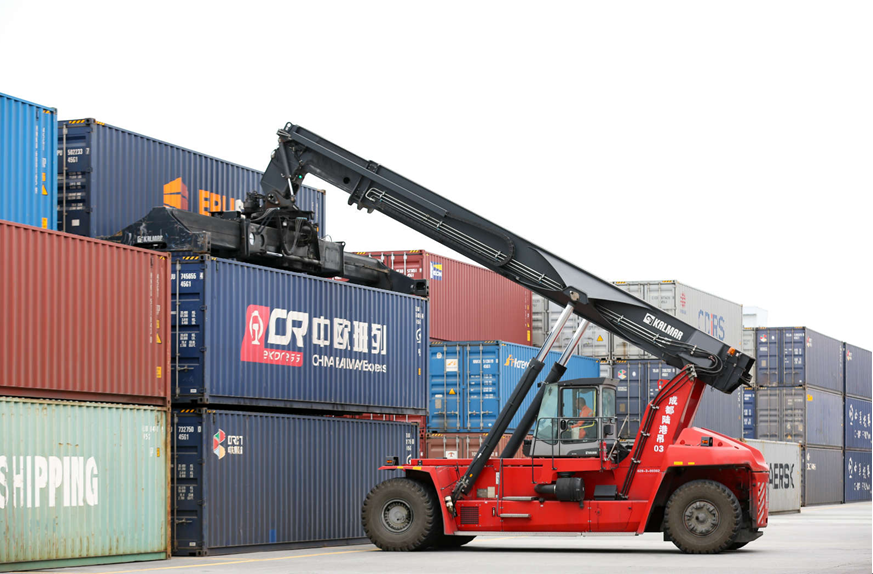 A crane stacks containers for China-Europe freight trains at a railway port in Chengdu, southwest China's Sichuan province, Oct. 14. Photo by Bai Guibin/People's Daily Online