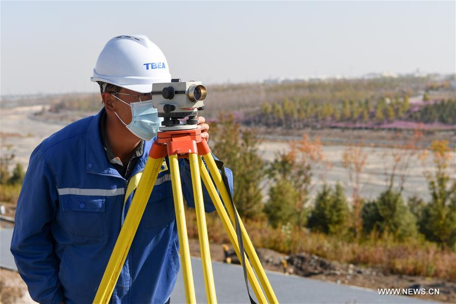 A staff member works at a construction site of an ecological project in Changji City, northwest China's Xinjiang Uygur Autonomous Region, Oct. 16, 2020. An ecological project aiming to build five theme parks around the Xinjiang Grand Theatre is expected to be put into service by the end of this year, as a way to improve the environment along the Toutun River. (Xinhua/Ding Lei)