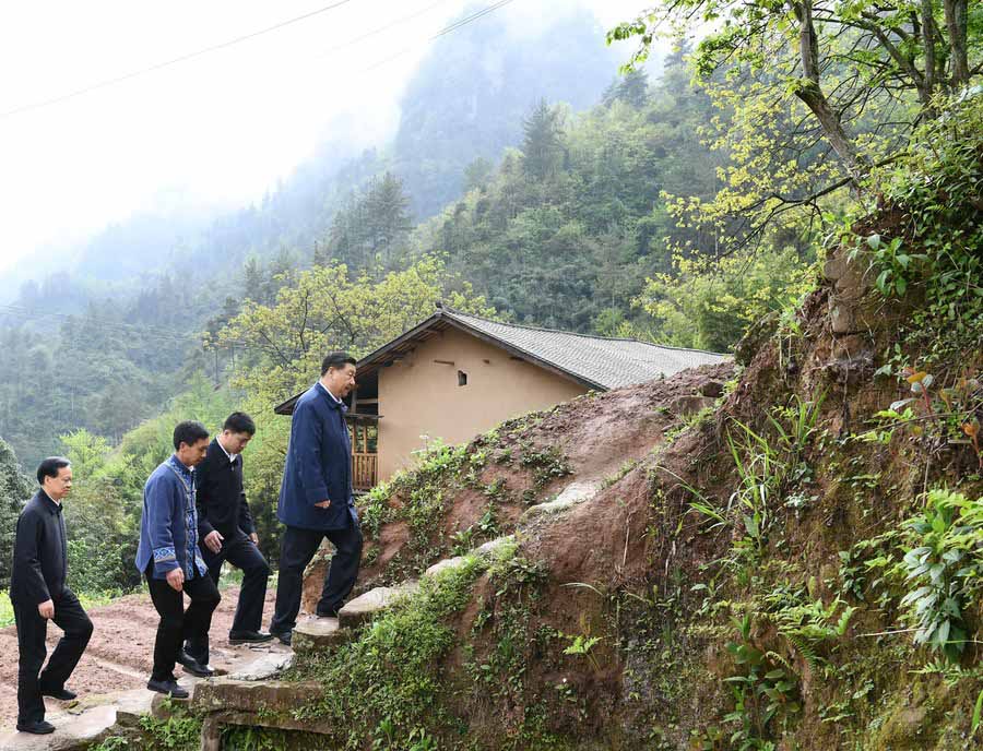 Xi Jinping walks to the house of Tan Dengzhou, an impoverished villager, in Huaxi Village, southwest China's Chongqing, April 15, 2019. (Xinhua/Xie Huanchi)