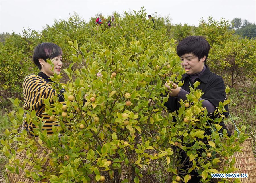 Villagers collect fruits of oil-tea camellia at a planting base in Hongxing Sub-district of Jingning She Autonomous County in Lishui, east China's Zhejiang Province, Oct. 18, 2020. (Photo by Li Suren/Xinhua)