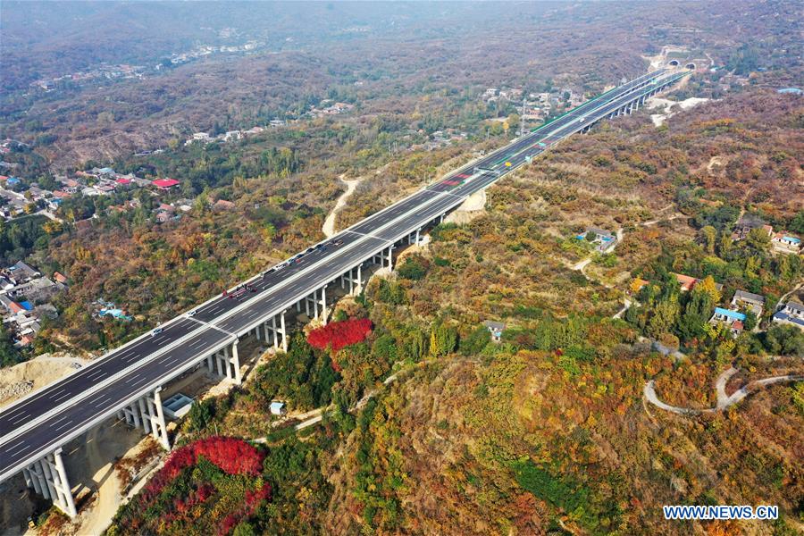 Aerial photo taken on Oct. 26, 2020 shows the Jinan-Tai'an expressway in east China's Shandong Province. The expressway linking Jinan and Tai'an in east China's Shandong Province will be put into operation soon. The expressway will shorten the travel time between the two places to half an hour after its operation. (Xinhua/Xing Guangli)
