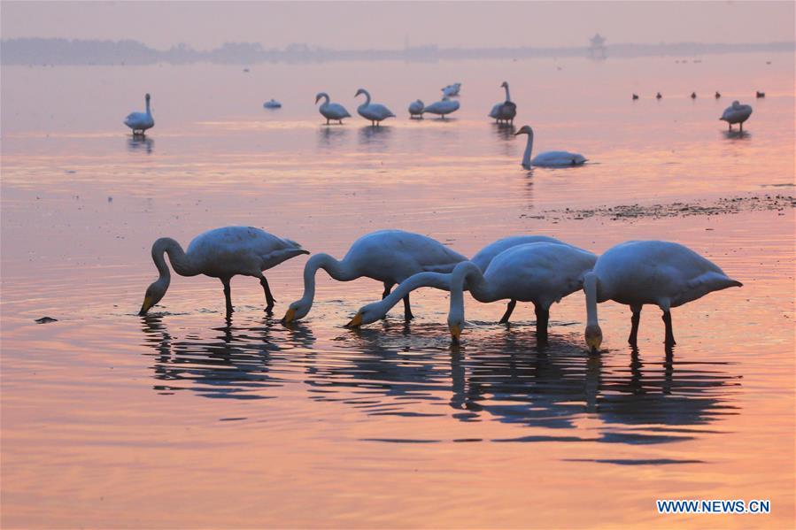 Swans are pictured at a lake in Rongcheng, east China's Shandong Province, early Oct. 26, 2020. (Photo by Wang Fudong/Xinhua)