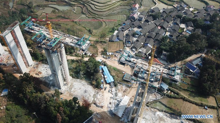 Aerial photo shows a viaduct to Xiangxi Airport under construction in Huayuan County, central China's Hunan Province, Oct. 27, 2020. Xiangxi Airport is expected to be put in use in 2021. (Xinhua/Chen Zeguo)