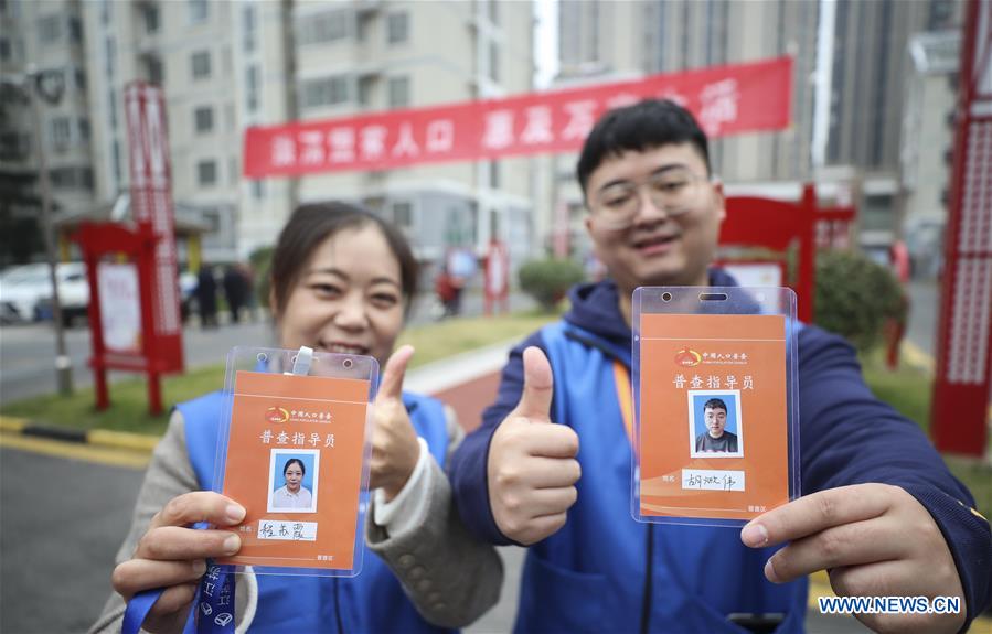 Census takers pose for photos at a community of Huai'an, east China's Jiangsu Province, Nov. 1, 2020. China on Sunday started its seventh national population count, with about 7 million census takers going door to door to document demographic changes in the world's most populous country. (Photo by Zhao Qirui/Xinhua)
