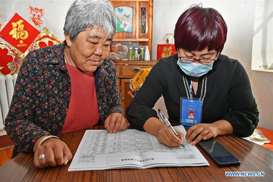 A census taker registers a resident's information at a community of economic development zone of Yantai, east China's Shandong Province, Nov. 1, 2020. China on Sunday started its seventh national population count, with about 7 million census takers going door to door to document demographic changes in the world's most populous country. (Photo by Sun Wentan/Xinhua)