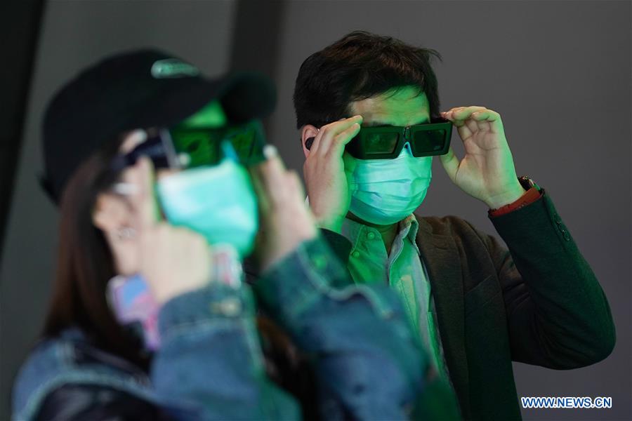 People try virtual simulation devices at a new technology and products exhibition during the 2020 China Science Fiction Conference in Beijing, capital of China, Nov. 11, 2020. The fifth China Science Fiction Conference was opened here on Sunday. Jointly organized by the China Association for Science and Technology (CAST) and the Beijing municipal government, this year's conference features both online and offline events, including an opening ceremony, forums and exhibitions. (Xinhua/Ju Huanzong)