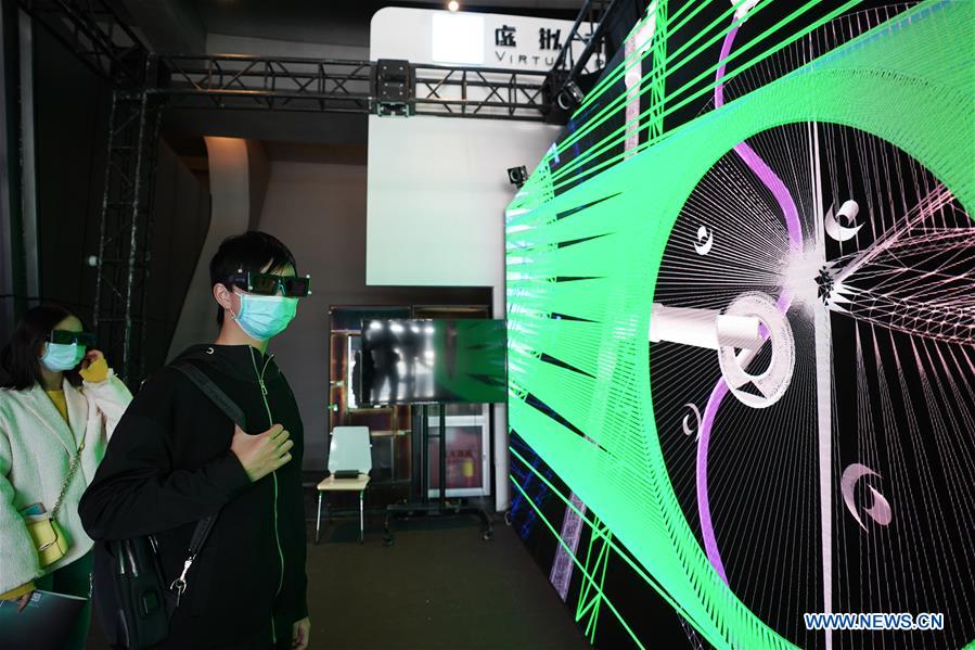 A man tries a virtual simulation device at a new technology and products exhibition during the 2020 China Science Fiction Conference in Beijing, capital of China, Nov. 11, 2020. The fifth China Science Fiction Conference was opened here on Sunday. Jointly organized by the China Association for Science and Technology (CAST) and the Beijing municipal government, this year's conference features both online and offline events, including an opening ceremony, forums and exhibitions. (Xinhua/Ju Huanzong)