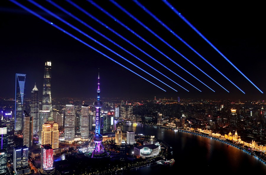 Beams of light are projected from the Sinar Mas Plaza in Shanghai, east China, Oct. 26, 2020. A light show will be held on Nov. 5 to celebrate the opening of the third China International Import Expo (CIIE), which will take place in Shanghai from Nov. 5 to 10. (Xinhua/Fang Zhe)