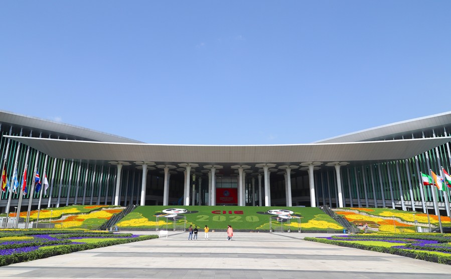 Photo shows decorations at the west entrance of the National Exhibition and Convention Center (Shanghai) in east China's Shanghai, Oct. 23, 2020. (Xinhua/Fang Zhe)