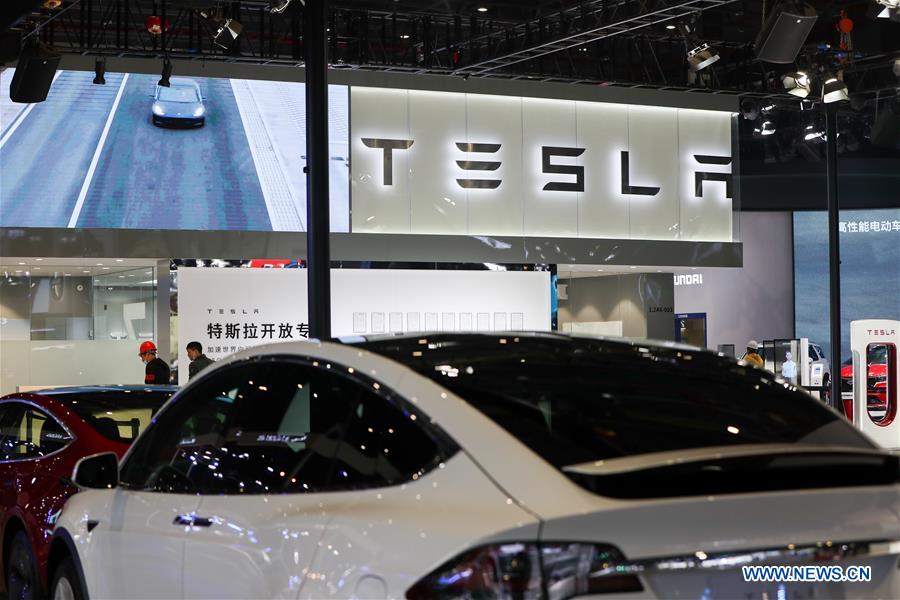 Photo taken on Nov. 2, 2020 shows an exhibition area of Tesla of the 3rd China International Import Expo (CIIE) in east China's Shanghai. The third CIIE will be held from Nov. 5 to 10 in Shanghai. (Xinhua/Ding Ting)