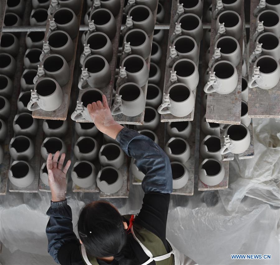 A worker makes mugs at a porcelain factory in Dehua County, Quanzhou, southeast China's Fujian Province, Oct. 21, 2020. A major porcelain-production center, Dehua in southeast China's Fujian Province has been making export porcelain since the Song Dynasty (960-1279 AD). The plain white porcelain crafted here was later dubbed "Blanc de Chine (White from China)" by the French and gained worldwide fame. As one of the traditional dragon kilns with long, thin and slightly sloped structures, the only remaining ancient kiln in Dehua is the Yueji Kiln, which has been burning continuously for more than 400 years. While the city preserves the ancient kiln, there are new-generation artisans seeking creativity on top of heritage. Xu Jinbao, who'd rather define himself as a "technical artisan", is among such innovators in the porcelain manufacturer circle of Dehua. After graduating from Shanghai Jiao Tong University with a degree in materials science, Xu returned to Dehua and set up a technology company which aims at finding improved ceramic solutions by making tweaks to the ingredients. Xu's ceramics products feature better heat-resistant, corrosion-proof and absorption performances than their older, traditional counterparts. He and colleagues have already debuted ceramic kettles which work on direct heat, and ceramic filters for water purifiers will be introduced soon. Like Xu Jinbao and his company, a growing number of Dehua-based porcelain enterprises have optimized production via technical upgrades, securing orders with a continuous supply of state-of-the-art, quality "Blanc de Chine" to global clients. (Xinhua/Song Weiwei)