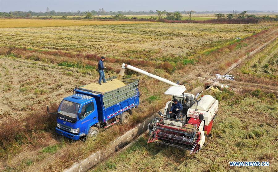 Aerial photo taken on Nov. 3, 2020 shows farmers loading harvested paddy rice in Jiangxiang Town, Nanchang of east China's Jiangxi Province. (Xinhua/Peng Zhaozhi)
