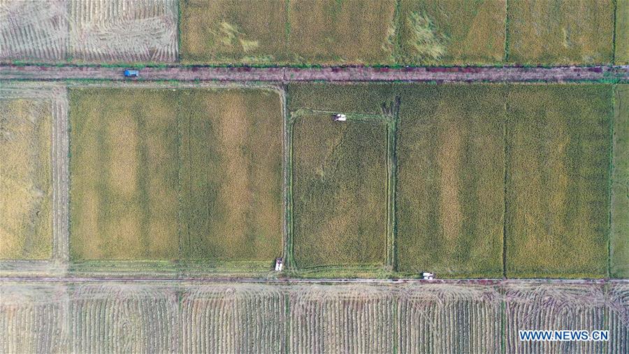 Aerial photo taken on Nov. 3, 2020 shows farmers harvesting paddy rice in Jiangxiang Town, Nanchang of east China's Jiangxi Province. (Xinhua/Peng Zhaozhi)