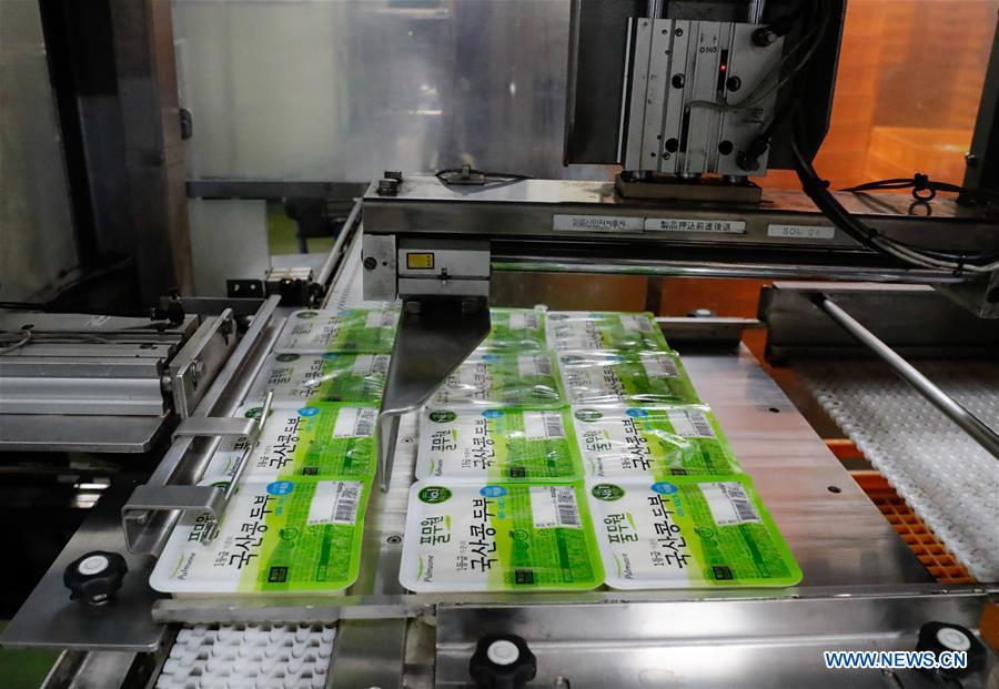 Photo taken on Nov. 3, 2020 shows boxed tofu products on the assembly line at a tofu plant of Pulmuone in Eumseong-gun of Chungcheongbuk-do, South Korea. Pulmuone, a leading food company in South Korea, will be an exhibitor at the third China International Import Expo (CIIE), which will take place from Nov. 5 to 10 in Shanghai. (Xinhua/Wang Jingqiang)