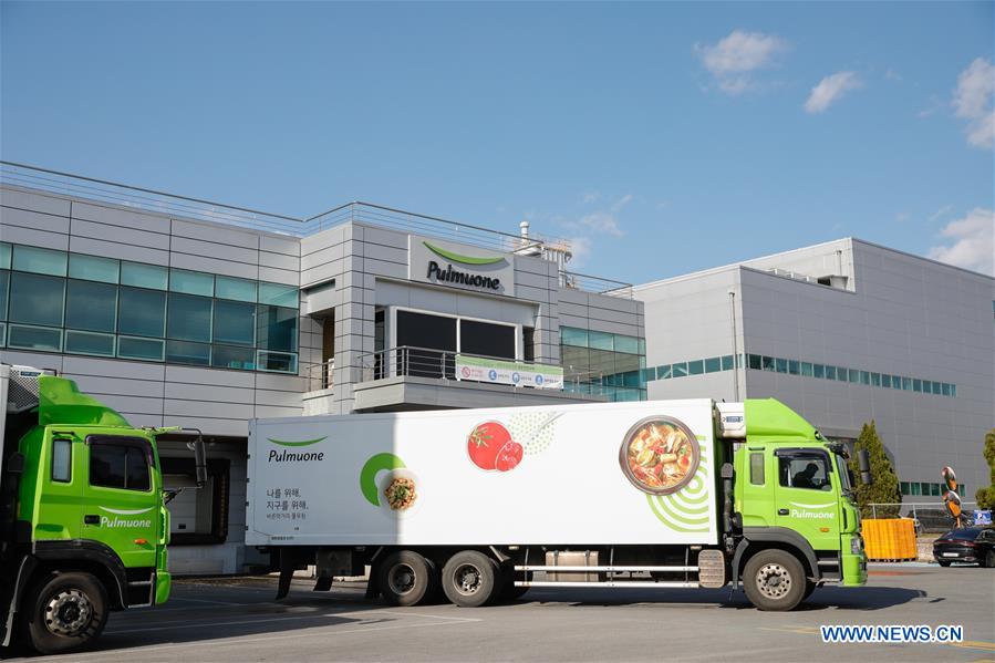 Photo taken on Nov. 3, 2020 shows trucks at a tofu plant of Pulmuone in Eumseong-gun of Chungcheongbuk-do, South Korea. Pulmuone, a leading food company in South Korea, will be an exhibitor at the third China International Import Expo (CIIE), which will take place from Nov. 5 to 10 in Shanghai. (Xinhua/Wang Jingqiang)