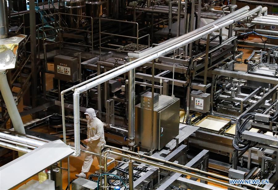 A staff member works at a tofu plant of Pulmuone in Eumseong-gun of Chungcheongbuk-do, South Korea, Nov. 3, 2020. Pulmuone, a leading food company in South Korea, will be an exhibitor at the third China International Import Expo (CIIE), which will take place from Nov. 5 to 10 in Shanghai. (Xinhua/Wang Jingqiang)
